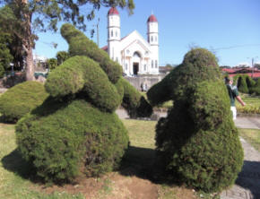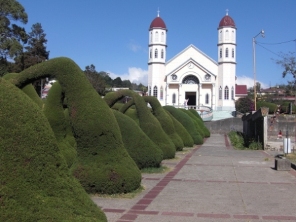 The route from Póas takes us into the town of Grecia (Greece) to visit its unique double steeple metal church imported from Belgium in 1894 that your knowledgeable guide will tell more about. And where we'll have the opportunity to have lunch. You’ll then travel another 15 minutes to the town of Sarchi to visit its 1903 oxcart factory and many souvenir shops. Afterwards you ’ll have the option of adding for $15/p another nearly 1 hour drive through dairy and vegetable farms to the lovely town of Zarcero, with its cool mountain air, & unusual topiary gardens of juniper shrubs sculptured into wonderful enchanting figures, in a beautiful park in front of the town’s church. A scenic 1 hour drive back to San José ends our day. |