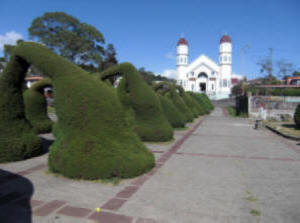 The optional Scenic Sightseeing Route”, $100*, to Arenal turns off the Pan-American Highway for a brief stop in the town of Grecia (Greece) to visit its unique double steeple metal church imported from Belgium in 1894 that your knowledgeable guide will tell more about. You’ll then travel another 20 minutes to the town of Sarchi to visit its 1903 oxcart factory and many souvenir shops.  After lunch we’ll continue another ½ hour through dairy and vegetable farms to the lovely town of Zarcero, with its cool mountain air, & unusual topiary gardens of juniper shrubs sculptured into wonderful enchanting figures, all in the beautiful Central Park in front of the town’s church. We'll then continue on a scenic drive for about 1.5 hrs, at first through more highland dairy and vegetable farms, then as we descend into the Northern Plains we’ll see more diverse agricultural land for beef cattle, sugar cane and other crops. By 4:00 p.m., as we get closer to the small tourism boom town of La Fortuna the imposing view of Arenal Volcano begins to dominate the landscape. Continue reading further below "Common description of Arenal for all routes".