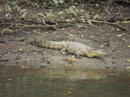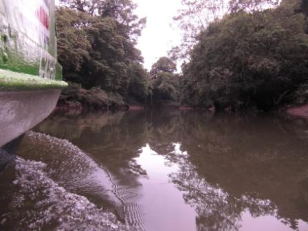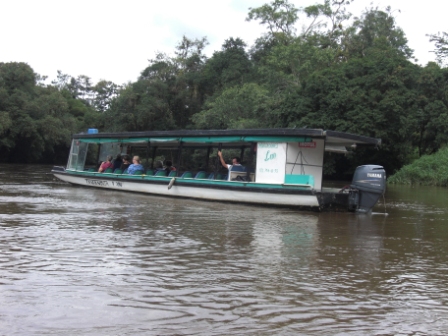 JUNGLE RIVER WILDLIFE MOTORBOAT CRUISE: About 1 hour after lunch, around 2:00 p.m. we arrive at the river town of Puerto Viejo. Here we’ll take a covered motorboat cruise for 2 hours, either up or down stream, on the calm flowing waters of the shaded jungle lined banks of the Sarapiquí River, and if we go up stream we will explore the forest lined banks of the tributary of Puerto Viejo River where the world renowned Research Station of the Organization for Tropical Studies (OTS) is located. This is a pleasant and relaxing way to see MONKEYS, colorful TROPICAL BIRDS, IGUANAS, CROCODILES OR CAIMANS, SLOTHS and other tropical animals that your knowledgeable guide and boat captain will help find and point out to you in addition to interesting facts about these animals. You’ll also see what life on a tropical jungle river is like, with children swimming, people fishing in the river, farmland, banana plantations and the occasional home on the banks. We carry a full compliment of refreshments, from cold beer to sodas & bottled water on our boat trip, as we do in our vehicles, available all day long at no extra cost. Immediately after the boat trip we’ll drive a couple of short blocks to a souvenir shop to make use of their restrooms where you’ll also have the opportunity to purchase beautiful art, woodcrafts and souvenirs at economical prices. Sarapiquí River wildlife