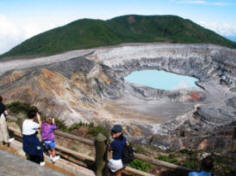 POAS VOLCANO: At approximately 9:00 a.m. we’ll enter the cloud forest of the Poás Volcano National Park where we'll walk 400 scenic yards on a paved pathway to the crater, located at a cool 8,500 ft. above sea level. Your guide will show you the beautiful giant leaves of the “Poor Man’s Umbrella” plant, epiphytes (air plants) and other plant species unique to the lush tropical cloud forest ecosystem that lines the walk to the crater. From the crater’s rim you’ll have the unique experience of looking down 500 ft. into an active volcano crater that's nearly 3/4 of a mile in diameter and constantly emitting sulfur fumes and steam from its 'fumaroles'. The crater's array of colorful rock strata, aqua green colored acid lake surrounded by tropical could forest and barren old lava floe rock formations together with the spectacular views of the surrounding landscape, gives your experienced professional guide plenty to tell you about. An optional walk via a rustic trail through the cloud forest back to the vehicle is available. |