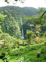 | HUMMINGBIRDS: A few miles down the scenic road with forest lined canyons and farm land we'll stop to have delicious typical lunch at a rustic country restaurant with wood burning stove and a breathtaking view of the San Fernando Falls and enjoy a hummingbird gallery. A 300 ft. high spout of pristine water spilling out of an impressive rainforest lined canyon in the near distance, provides a spectacular background to a wide variety of hummingbirds feeding from the hanging feeders giving you an excellent opportunity to admire and photograph these amazing birds, among other possible birds such as Tanagers and the Emerald Green Toucanet. LUNCH: Here in front of the San Fernando Falls we'll stop for lunch at rustic typical Costa Rican restaurant with a variety of delicious local food cooked over a wood burning stove and tasty fruit refreshments while enjoying the hummingbird gallery. |